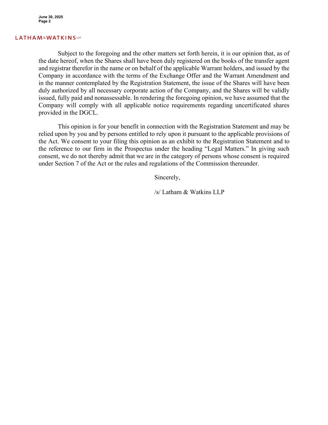 June 30, 2025 Page 2 Subject to the foregoing and the other matters set forth herein, it is our opinion that, as of the date hereof, when the Shares shall have been duly registered on the books of the transfer agent and registrar therefor in the name or on behalf of the applicable Warrant holders, and issued by the Company in accordance with the terms of the Exchange Offer and the Warrant Amendment and in the manner contemplated by the Registration Statement, the issue of the Shares will have been duly authorized by all necessary corporate action of the Company, and the Shares will be validly issued, fully paid and nonassessable. In rendering the foregoing opinion, we have assumed that the Company will comply with all applicable notice requirements regarding uncertificated shares provided in the DGCL. This opinion is for your benefit in connection with the Registration Statement and may be relied upon by you and by persons entitled to rely upon it pursuant to the applicable provisions of the Act. We consent to your filing this opinion as an exhibit to the Registration Statement and to the reference to our firm in the Prospectus under the heading “Legal Matters.” In giving such consent, we do not thereby admit that we are in the category of persons whose consent is required under Section 7 of the Act or the rules and regulations of the Commission thereunder. Sincerely, /s/ Latham & Watkins LLP