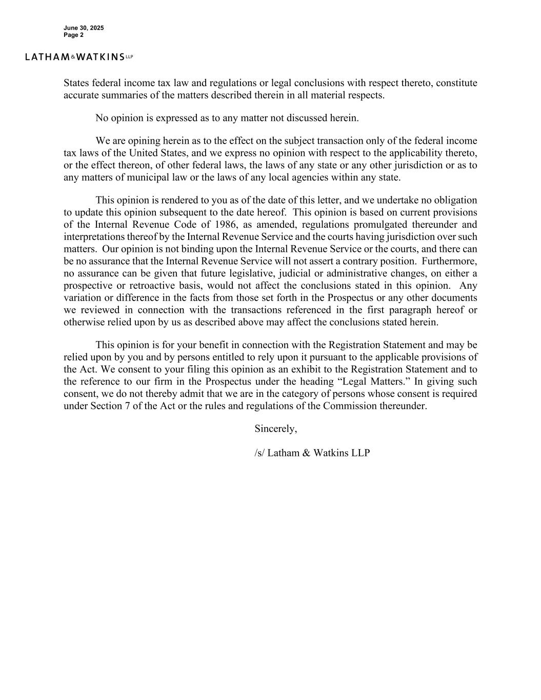 June 30, 2025 Page 2 States federal income tax law and regulations or legal conclusions with respect thereto, constitute accurate summaries of the matters described therein in all material respects. No opinion is expressed as to any matter not discussed herein. We are opining herein as to the effect on the subject transaction only of the federal income tax laws of the United States, and we express no opinion with respect to the applicability thereto, or the effect thereon, of other federal laws, the laws of any state or any other jurisdiction or as to any matters of municipal law or the laws of any local agencies within any state. This opinion is rendered to you as of the date of this letter, and we undertake no obligation to update this opinion subsequent to the date hereof. This opinion is based on current provisions of the Internal Revenue Code of 1986, as amended, regulations promulgated thereunder and interpretations thereof by the Internal Revenue Service and the courts having jurisdiction over such matters. Our opinion is not binding upon the Internal Revenue Service or the courts, and there can be no assurance that the Internal Revenue Service will not assert a contrary position. Furthermore, no assurance can be given that future legislative, judicial or administrative changes, on either a prospective or retroactive basis, would not affect the conclusions stated in this opinion. Any variation or difference in the facts from those set forth in the Prospectus or any other documents we reviewed in connection with the transactions referenced in the first paragraph hereof or otherwise relied upon by us as described above may affect the conclusions stated herein. This opinion is for your benefit in connection with the Registration Statement and may be relied upon by you and by persons entitled to rely upon it pursuant to the applicable provisions of the Act. We consent to your filing this opinion as an exhibit to the Registration Statement and to the reference to our firm in the Prospectus under the heading “Legal Matters.” In giving such consent, we do not thereby admit that we are in the category of persons whose consent is required under Section 7 of the Act or the rules and regulations of the Commission thereunder. Sincerely, /s/ Latham & Watkins LLP