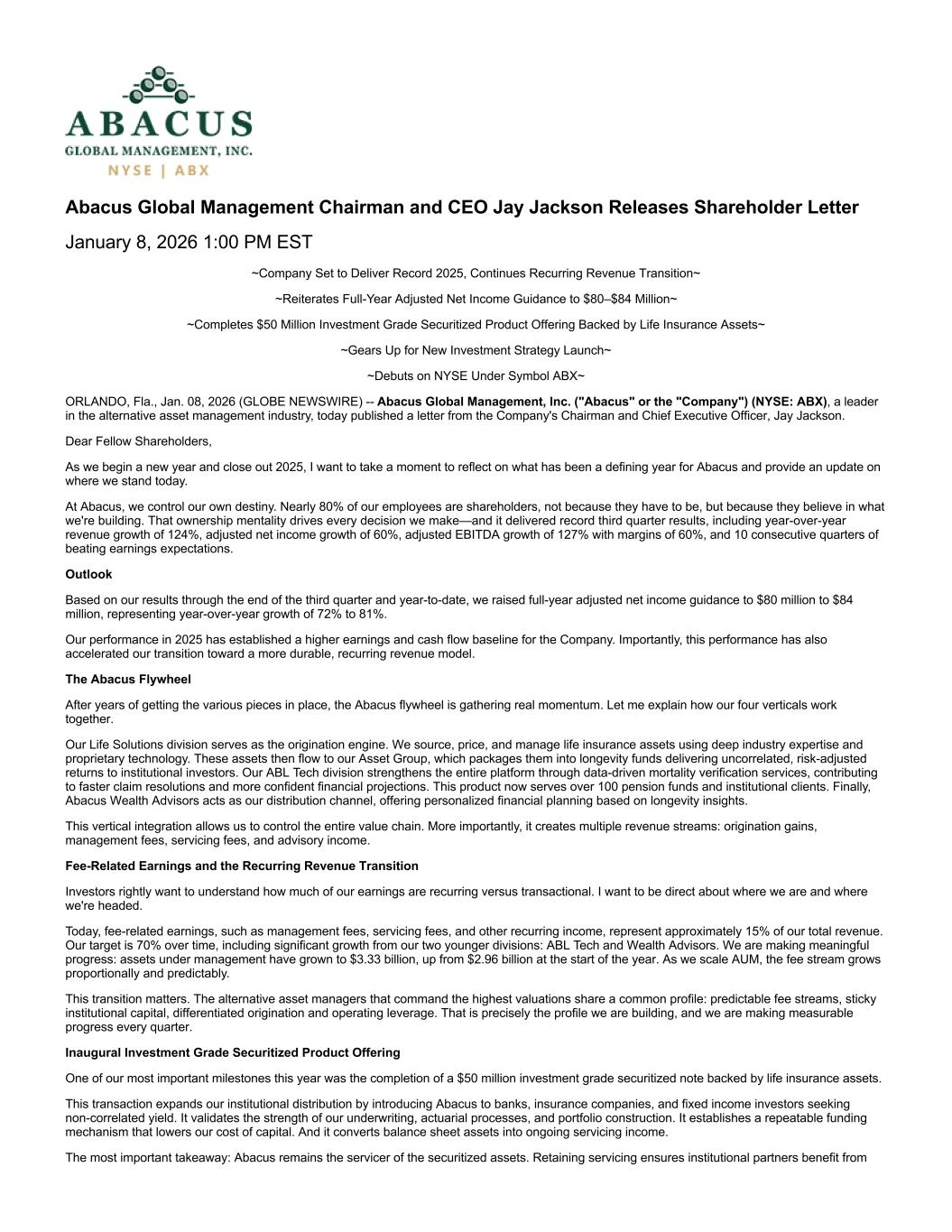 Abacus Global Management Chairman and CEO Jay Jackson Releases Shareholder Letter January 8, 2026 1:00 PM EST ~Company Set to Deliver Record 2025, Continues Recurring Revenue Transition~ ~Reiterates Full-Year Adjusted Net Income Guidance to $80–$84 Million~ ~Completes $50 Million Investment Grade Securitized Product Offering Backed by Life Insurance Assets~ ~Gears Up for New Investment Strategy Launch~ ~Debuts on NYSE Under Symbol ABX~ ORLANDO, Fla., Jan. 08, 2026 (GLOBE NEWSWIRE) -- Abacus Global Management, Inc. ("Abacus" or the "Company") (NYSE: ABX), a leader in the alternative asset management industry, today published a letter from the Company's Chairman and Chief Executive Officer, Jay Jackson. Dear Fellow Shareholders, As we begin a new year and close out 2025, I want to take a moment to reflect on what has been a defining year for Abacus and provide an update on where we stand today. At Abacus, we control our own destiny. Nearly 80% of our employees are shareholders, not because they have to be, but because they believe in what we're building. That ownership mentality drives every decision we make—and it delivered record third quarter results, including year-over-year revenue growth of 124%, adjusted net income growth of 60%, adjusted EBITDA growth of 127% with margins of 60%, and 10 consecutive quarters of beating earnings expectations. Outlook Based on our results through the end of the third quarter and year-to-date, we raised full-year adjusted net income guidance to $80 million to $84 million, representing year-over-year growth of 72% to 81%. Our performance in 2025 has established a higher earnings and cash flow baseline for the Company. Importantly, this performance has also accelerated our transition toward a more durable, recurring revenue model. The Abacus Flywheel After years of getting the various pieces in place, the Abacus flywheel is gathering real momentum. Let me explain how our four verticals work together. Our Life Solutions division serves as the origination engine. We source, price, and manage life insurance assets using deep industry expertise and proprietary technology. These assets then flow to our Asset Group, which packages them into longevity funds delivering uncorrelated, risk-adjusted returns to institutional investors. Our ABL Tech division strengthens the entire platform through data-driven mortality verification services, contributing to faster claim resolutions and more confident financial projections. This product now serves over 100 pension funds and institutional clients. Finally, Abacus Wealth Advisors acts as our distribution channel, offering personalized financial planning based on longevity insights. This vertical integration allows us to control the entire value chain. More importantly, it creates multiple revenue streams: origination gains, management fees, servicing fees, and advisory income. Fee-Related Earnings and the Recurring Revenue Transition Investors rightly want to understand how much of our earnings are recurring versus transactional. I want to be direct about where we are and where we're headed. Today, fee-related earnings, such as management fees, servicing fees, and other recurring income, represent approximately 15% of our total revenue. Our target is 70% over time, including significant growth from our two younger divisions: ABL Tech and Wealth Advisors. We are making meaningful progress: assets under management have grown to $3.33 billion, up from $2.96 billion at the start of the year. As we scale AUM, the fee stream grows proportionally and predictably. This transition matters. The alternative asset managers that command the highest valuations share a common profile: predictable fee streams, sticky institutional capital, differentiated origination and operating leverage. That is precisely the profile we are building, and we are making measurable progress every quarter. Inaugural Investment Grade Securitized Product Offering One of our most important milestones this year was the completion of a $50 million investment grade securitized note backed by life insurance assets. This transaction expands our institutional distribution by introducing Abacus to banks, insurance companies, and fixed income investors seeking non-correlated yield. It validates the strength of our underwriting, actuarial processes, and portfolio construction. It establishes a repeatable funding mechanism that lowers our cost of capital. And it converts balance sheet assets into ongoing servicing income. The most important takeaway: Abacus remains the servicer of the securitized assets. Retaining servicing ensures institutional partners benefit from