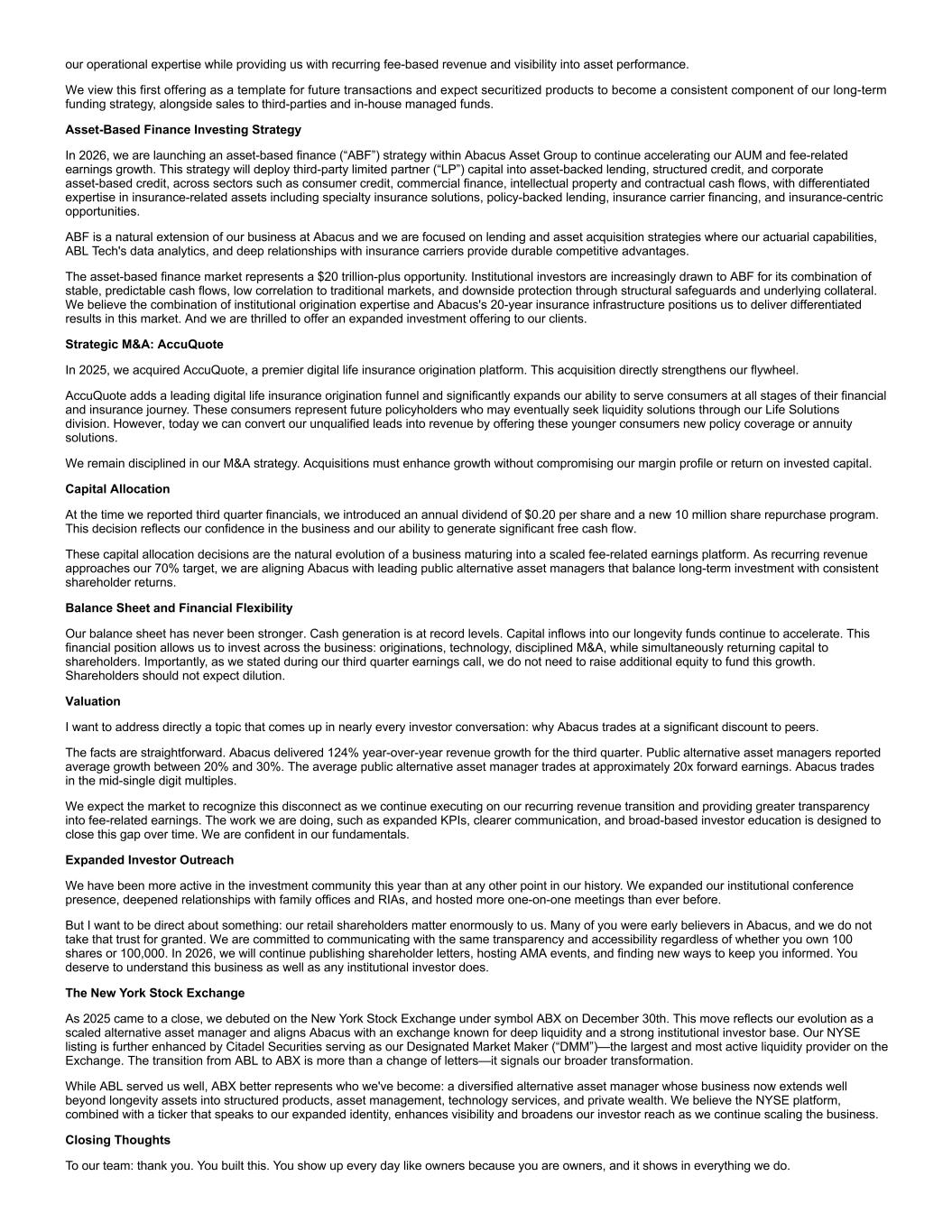 our operational expertise while providing us with recurring fee-based revenue and visibility into asset performance. We view this first offering as a template for future transactions and expect securitized products to become a consistent component of our long-term funding strategy, alongside sales to third-parties and in-house managed funds. Asset-Based Finance Investing Strategy In 2026, we are launching an asset-based finance (“ABF”) strategy within Abacus Asset Group to continue accelerating our AUM and fee-related earnings growth. This strategy will deploy third-party limited partner (“LP”) capital into asset-backed lending, structured credit, and corporate asset-based credit, across sectors such as consumer credit, commercial finance, intellectual property and contractual cash flows, with differentiated expertise in insurance-related assets including specialty insurance solutions, policy-backed lending, insurance carrier financing, and insurance-centric opportunities. ABF is a natural extension of our business at Abacus and we are focused on lending and asset acquisition strategies where our actuarial capabilities, ABL Tech's data analytics, and deep relationships with insurance carriers provide durable competitive advantages. The asset-based finance market represents a $20 trillion-plus opportunity. Institutional investors are increasingly drawn to ABF for its combination of stable, predictable cash flows, low correlation to traditional markets, and downside protection through structural safeguards and underlying collateral. We believe the combination of institutional origination expertise and Abacus's 20-year insurance infrastructure positions us to deliver differentiated results in this market. And we are thrilled to offer an expanded investment offering to our clients. Strategic M&A: AccuQuote In 2025, we acquired AccuQuote, a premier digital life insurance origination platform. This acquisition directly strengthens our flywheel. AccuQuote adds a leading digital life insurance origination funnel and significantly expands our ability to serve consumers at all stages of their financial and insurance journey. These consumers represent future policyholders who may eventually seek liquidity solutions through our Life Solutions division. However, today we can convert our unqualified leads into revenue by offering these younger consumers new policy coverage or annuity solutions. We remain disciplined in our M&A strategy. Acquisitions must enhance growth without compromising our margin profile or return on invested capital. Capital Allocation At the time we reported third quarter financials, we introduced an annual dividend of $0.20 per share and a new 10 million share repurchase program. This decision reflects our confidence in the business and our ability to generate significant free cash flow. These capital allocation decisions are the natural evolution of a business maturing into a scaled fee-related earnings platform. As recurring revenue approaches our 70% target, we are aligning Abacus with leading public alternative asset managers that balance long-term investment with consistent shareholder returns. Balance Sheet and Financial Flexibility Our balance sheet has never been stronger. Cash generation is at record levels. Capital inflows into our longevity funds continue to accelerate. This financial position allows us to invest across the business: originations, technology, disciplined M&A, while simultaneously returning capital to shareholders. Importantly, as we stated during our third quarter earnings call, we do not need to raise additional equity to fund this growth. Shareholders should not expect dilution. Valuation I want to address directly a topic that comes up in nearly every investor conversation: why Abacus trades at a significant discount to peers. The facts are straightforward. Abacus delivered 124% year-over-year revenue growth for the third quarter. Public alternative asset managers reported average growth between 20% and 30%. The average public alternative asset manager trades at approximately 20x forward earnings. Abacus trades in the mid-single digit multiples. We expect the market to recognize this disconnect as we continue executing on our recurring revenue transition and providing greater transparency into fee-related earnings. The work we are doing, such as expanded KPIs, clearer communication, and broad-based investor education is designed to close this gap over time. We are confident in our fundamentals. Expanded Investor Outreach We have been more active in the investment community this year than at any other point in our history. We expanded our institutional conference presence, deepened relationships with family offices and RIAs, and hosted more one-on-one meetings than ever before. But I want to be direct about something: our retail shareholders matter enormously to us. Many of you were early believers in Abacus, and we do not take that trust for granted. We are committed to communicating with the same transparency and accessibility regardless of whether you own 100 shares or 100,000. In 2026, we will continue publishing shareholder letters, hosting AMA events, and finding new ways to keep you informed. You deserve to understand this business as well as any institutional investor does. The New York Stock Exchange As 2025 came to a close, we debuted on the New York Stock Exchange under symbol ABX on December 30th. This move reflects our evolution as a scaled alternative asset manager and aligns Abacus with an exchange known for deep liquidity and a strong institutional investor base. Our NYSE listing is further enhanced by Citadel Securities serving as our Designated Market Maker (“DMM”)—the largest and most active liquidity provider on the Exchange. The transition from ABL to ABX is more than a change of letters—it signals our broader transformation. While ABL served us well, ABX better represents who we've become: a diversified alterna