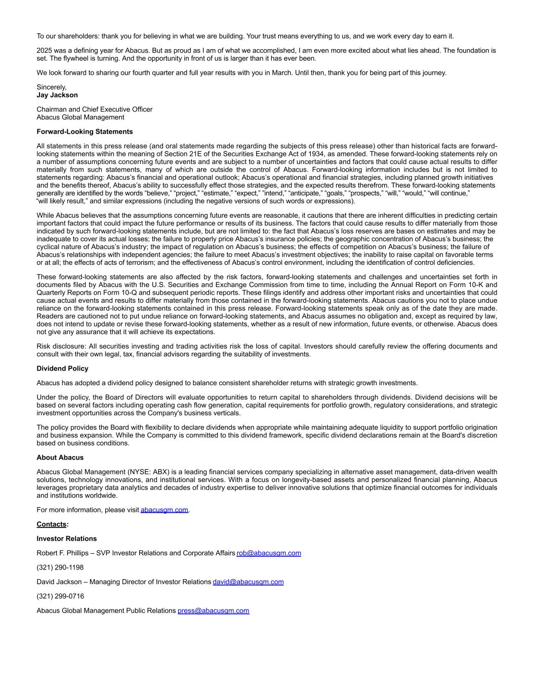 To our shareholders: thank you for believing in what we are building. Your trust means everything to us, and we work every day to earn it. 2025 was a defining year for Abacus. But as proud as I am of what we accomplished, I am even more excited about what lies ahead. The foundation is set. The flywheel is turning. And the opportunity in front of us is larger than it has ever been. We look forward to sharing our fourth quarter and full year results with you in March. Until then, thank you for being part of this journey. Sincerely, Jay Jackson Chairman and Chief Executive Officer Abacus Global Management Forward-Looking Statements All statements in this press release (and oral statements made regarding the subjects of this press release) other than historical facts are forward- looking statements within the meaning of Section 21E of the Securities Exchange Act of 1934, as amended. These forward-looking statements rely on a number of assumptions concerning future events and are subject to a number of uncertainties and factors that could cause actual results to differ materially from such statements, many of which are outside the control of Abacus. Forward-looking information includes but is not limited to statements regarding: Abacus’s financial and operational outlook; Abacus’s operational and financial strategies, including planned growth initiatives and the benefits thereof, Abacus’s ability to successfully effect those strategies, and the expected results therefrom. These forward-looking statements generally are identified by the words “believe,” “project,” “estimate,” “expect,” ”intend,” “anticipate,” “goals,” “prospects,” “will,” “would,” “will continue,” “will likely result,” and similar expressions (including the negative versions of such words or expressions). While Abacus believes that the assumptions concerning future events are reasonable, it cautions that there are inherent difficulties in predicting certain important factors that could impact the future performance or results of its business. The factors that could cause results to differ materially from those indicated by such forward-looking statements include, but are not limited to: the fact that Abacus’s loss reserves are bases on estimates and may be inadequate to cover its actual losses; the failure to properly price Abacus’s insurance policies; the geographic concentration of Abacus’s business; the cyclical nature of Abacus’s industry; the impact of regulation on Abacus’s business; the effects of competition on Abacus’s business; the failure of Abacus’s relationships with independent agencies; the failure to meet Abacus’s investment objectives; the inability to raise capital on favorable terms or at all; the effects of acts of terrorism; and the effectiveness of Abacus’s control environment, including the identification of control deficiencies. These forward-looking statements are also affected by the risk factors, forward-looking statements and challenges and uncertainties set forth in documents filed by Abacus with the U.S. Securities and Exchange Commission from time to time, including the Annual Report on Form 10-K and Quarterly Reports on Form 10-Q and subsequent periodic reports. These filings identify and address other important risks and uncertainties that could cause actual events and results to differ materially from those contained in the forward-looking statements. Abacus cautions you not to place undue reliance on the forward-looking statements contained in this press release. Forward-looking statements speak only as of the date they are made. Readers are cautioned not to put undue reliance on forward-looking statements, and Abacus assumes no obligation and, except as required by law, does not intend to update or revise these forward-looking statements, whether as a result of new information, future events, or otherwise. Abacus does not give any assurance that it will achieve its expectations. Risk disclosure: All securities investing and trading activities risk the loss of capital. Investors should carefully review the offering documents and consult with their own legal, tax, financial advisors regarding the suitability of investments. Dividend Policy Abacus has adopted a dividend policy designed to balance consistent shareholder returns with strategic growth investments. Under the policy, the Board of Directors will evaluate opportunities to return capital to shareholders through dividends. Dividend decisions will be based on several factors including operating cash flow generation, capital requirements for portfolio growth, regulatory considerations, and strategic investment opportunities across the Company's business verticals. The policy provides the Board with flexibility to declare dividends when appropriate while maintaining adequate liquidity to support portfolio origination and business expansion. While the Company is committed to this dividend framework, specific dividend declarations remain at the Board's discretion based on business conditions. About Abacus Abacus Global Management (NYSE: ABX) is a leading financial services company specializing in alternative asset management, data-driven wealth solutions, technology innovations, and institutional services. With a focus on longevity-based assets and personalized financial planning, Abacus leverages proprietary data analytics and decades of industry expertise to deliver innovative solutions that optimize financial outcomes for individuals and institutions worldwide. For more information, please visit abacusgm.com. Contacts: Investor Relations Robert F. Phillips – SVP Investor Relations and Corporate Affairs rob@abacusgm.com (321) 290-1198 David Jackson – Managing Director of Investor Relations david@abacusgm.com (321) 299-0716 Abacus Global Management Public Relations press@abacusgm.com