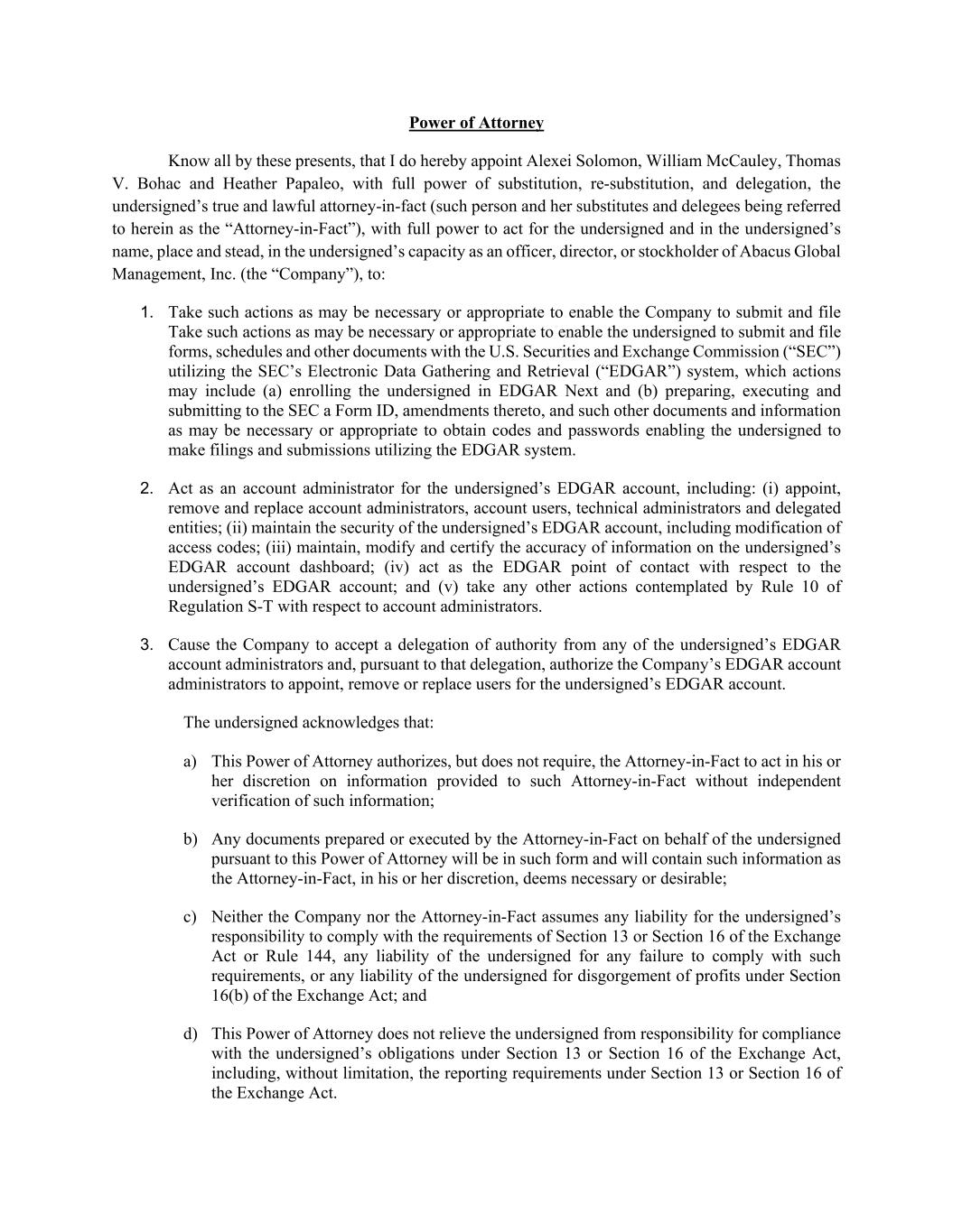 Power of Attorney Know all by these presents, that I do hereby appoint Alexei Solomon, William McCauley, Thomas V. Bohac and Heather Papaleo, with full power of substitution, re-substitution, and delegation, the undersigned’s true and lawful attorney-in-fact (such person and her substitutes and delegees being referred to herein as the “Attorney-in-Fact”), with full power to act for the undersigned and in the undersigned’s name, place and stead, in the undersigned’s capacity as an officer, director, or stockholder of Abacus Global Management, Inc. (the “Company”), to: 1. Take such actions as may be necessary or appropriate to enable the Company to submit and file Take such actions as may be necessary or appropriate to enable the undersigned to submit and file forms, schedules and other documents with the U.S. Securities and Exchange Commission (“SEC”) utilizing the SEC’s Electronic Data Gathering and Retrieval (“EDGAR”) system, which actions may include (a) enrolling the undersigned in EDGAR Next and (b) preparing, executing and submitting to the SEC a Form ID, amendments thereto, and such other documents and information as may be necessary or appropriate to obtain codes and passwords enabling the undersigned to make filings and submissions utilizing the EDGAR system. 2. Act as an account administrator for the undersigned’s EDGAR account, including: (i) appoint, remove and replace account administrators, account users, technical administrators and delegated entities; (ii) maintain the security of the undersigned’s EDGAR account, including modification of access codes; (iii) maintain, modify and certify the accuracy of information on the undersigned’s EDGAR account dashboard; (iv) act as the EDGAR point of contact with respect to the undersigned’s EDGAR account; and (v) take any other actions contemplated by Rule 10 of Regulation S-T with respect to account administrators. 3. Cause the Company to accept a delegation of authority from any of the undersigned’s EDGAR account administrators and, pursuant to that delegation, authorize the Company’s EDGAR account administrators to appoint, remove or replace users for the undersigned’s EDGAR account. The undersigned acknowledges that: a) This Power of Attorney authorizes, but does not require, the Attorney-in-Fact to act in his or her discretion on information provided to such Attorney-in-Fact without independent verification of such information; b) Any documents prepared or executed by the Attorney-in-Fact on behalf of the undersigned pursuant to this Power of Attorney will be in such form and will contain such information as the Attorney-in-Fact, in his or her discretion, deems necessary or desirable; c) Neither the Company nor the Attorney-in-Fact assumes any liability for the undersigned’s responsibility to comply with the requirements of Section 13 or Section 16 of the Exchange Act or Rule 144, any liability of the undersigned for any failure to comply with such requirements, or any liability of the undersigned for disgorgement of profits under Section 16(b) of the Exchange Act; and d) This Power of Attorney does not relieve the undersigned from responsibility for compliance with the undersigned’s obligations under Section 13 or Section 16 of the Exchange Act, including, without limitation, the reporting requirements under Section 13 or Section 16 of the Exchange Act.