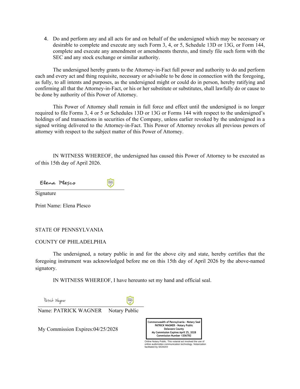 4. Do and perform any and all acts for and on behalf of the undersigned which may be necessary or desirable to complete and execute any such Form 3, 4, or 5, Schedule 13D or 13G, or Form 144, complete and execute any amendment or amendments thereto, and timely file such form with the SEC and any stock exchange or similar authority. The undersigned hereby grants to the Attorney-in-Fact full power and authority to do and perform each and every act and thing requisite, necessary or advisable to be done in connection with the foregoing, as fully, to all intents and purposes, as the undersigned might or could do in person, hereby ratifying and confirming all that the Attorney-in-Fact, or his or her substitute or substitutes, shall lawfully do or cause to be done by authority of this Power of Attorney. This Power of Attorney shall remain in full force and effect until the undersigned is no longer required to file Forms 3, 4 or 5 or Schedules 13D or 13G or Forms 144 with respect to the undersigned’s holdings of and transactions in securities of the Company, unless earlier revoked by the undersigned in a signed writing delivered to the Attorney-in-Fact. This Power of Attorney revokes all previous powers of attorney with respect to the subject matter of this Power of Attorney. IN WITNESS WHEREOF, the undersigned has caused this Power of Attorney to be executed as of this 15th day of April 2026. _________________________________ Signature Print Name: Elena Plesco STATE OF PENNSYLVANIA COUNTY OF PHILADELPHIA The undersigned, a notary public in and for the above city and state, hereby certifies that the foregoing instrument was acknowledged before me on this 15th day of April 2026 by the above-named signatory. IN WITNESS WHEREOF, I have hereunto set my hand and official seal. Name: PATRICK WAGNER Notary Public My Commission Expires:04/25/2028 Elena Plesco Patrick Wagner Online Notary Public. This notarial act involved the use of online audio/video communication technology. Notarization facilitated by SIGNiX®