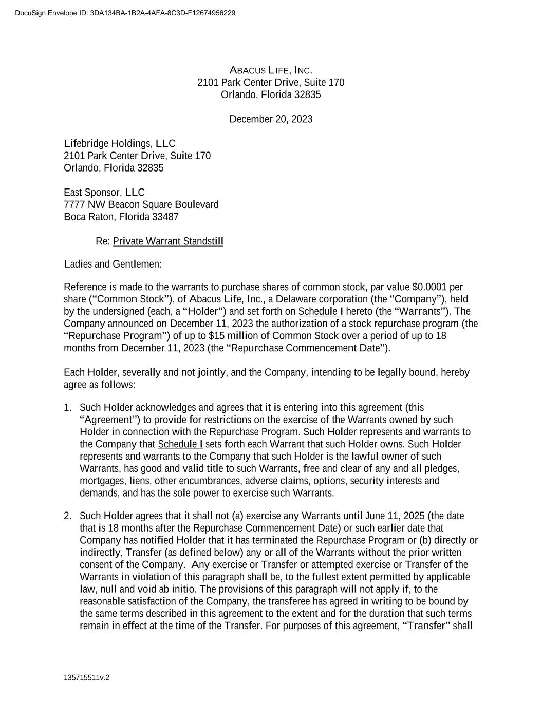 135715511v.2 ABACUS LIFE, INC. 2101 Park Center Drive, Suite 170 Orlando, Florida 32835 December 20, 2023 Lifebridge Holdings, LLC 2101 Park Center Drive, Suite 170 Orlando, Florida 32835 East Sponsor, LLC 7777 NW Beacon Square Boulevard Boca Raton, Florida 33487 Re: Private Warrant Standstill Ladies and Gentlemen: Reference is made to the warrants to purchase shares of common stock, par value $0.0001 per share (“Common Stock”), of Abacus Life, Inc., a Delaware corporation (the “Company”), held by the undersigned (each, a “Holder”) and set forth on Schedule I hereto (the “Warrants”). The Company announced on December 11, 2023 the authorization of a stock repurchase program (the “Repurchase Program”) of up to $15 million of Common Stock over a period of up to 18 months from December 11, 2023 (the “Repurchase Commencement Date”). Each Holder, severally and not jointly, and the Company, intending to be legally bound, hereby agree as follows: 1. Such Holder acknowledges and agrees that it is entering into this agreement (this “Agreement”) to provide for restrictions on the exercise of the Warrants owned by such Holder in connection with the Repurchase Program. Such Holder represents and warrants to the Company that Schedule I sets forth each Warrant that such Holder owns. Such Holder represents and warrants to the Company that such Holder is the lawful owner of such Warrants, has good and valid title to such Warrants, free and clear of any and all pledges, mortgages, liens, other encumbrances, adverse claims, options, security interests and demands, and has the sole power to exercise such Warrants. 2. Such Holder agrees that it shall not (a) exercise any Warrants until June 11, 2025 (the date that is 18 months after the Repurchase Commencement Date) or such earlier date that Company has notified Holder that it has terminated the Repurchase Program or (b) directly or indirectly, Transfer (as defined below) any or all of the Warrants without the prior written consent of the Company. Any exercise or Transfer or attempted exercise or Transfer of the Warrants in violation of this paragraph shall be, to the fullest extent permitted by applicable law, null and void ab initio. The provisions of this paragraph will not apply if, to the reasonable satisfaction of the Company, the transferee has agreed in writing to be bound by the same terms described in this agreement to the extent and for the duration that such terms remain in effect at the time of the Transfer. For purposes of this agreement, “Transfer” shall DocuSign Envelope ID: 3DA134BA-1B2A-4AFA-8C3D-F12674956229