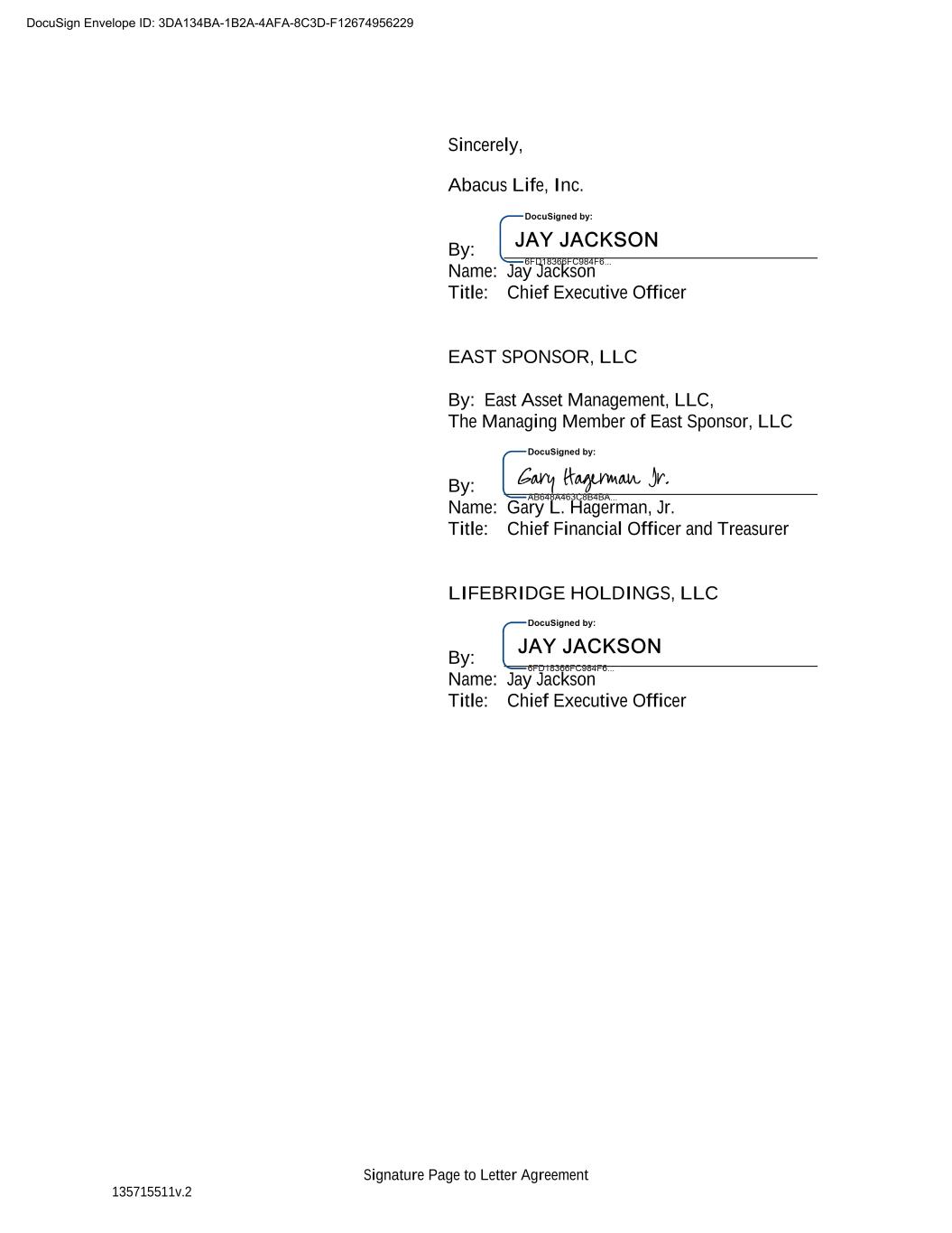 Signature Page to Letter Agreement 135715511v.2 Sincerely, Abacus Life, Inc. By: Name: Jay Jackson Title: Chief Executive Officer EAST SPONSOR, LLC By: East Asset Management, LLC, The Managing Member of East Sponsor, LLC By: Name: Gary L. Hagerman, Jr. Title: Chief Financial Officer and Treasurer LIFEBRIDGE HOLDINGS, LLC By: Name: Jay Jackson Title: Chief Executive Officer DocuSign Envelope ID: 3DA134BA-1B2A-4AFA-8C3D-F12674956229