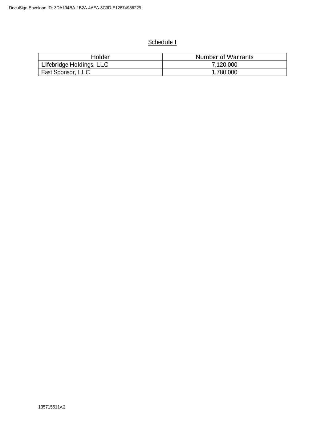 135715511v.2 Schedule I Holder Number of Warrants Lifebridge Holdings, LLC 7,120,000 East Sponsor, LLC 1,780,000 DocuSign Envelope ID: 3DA134BA-1B2A-4AFA-8C3D-F12674956229