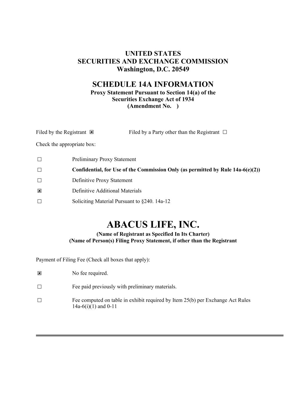 UNITED STATES SECURITIES AND EXCHANGE COMMISSION Washington, D.C. 20549 SCHEDULE 14A INFORMATION Proxy Statement Pursuant to Section 14(a) of the Securities Exchange Act of 1934 (Amendment No. ) Filed by the Registrant ☒ Filed by a Party other than the Registrant ☐ Check the appropriate box: ☐ Preliminary Proxy Statement ☐ Confidential, for Use of the Commission Only (as permitted by Rule 14a-6(e)(2)) ☐ Definitive Proxy Statement ☒ Definitive Additional Materials ☐ Soliciting Material Pursuant to §240. 14a-12 ABACUS LIFE, INC. (Name of Registrant as Specified In Its Charter) (Name of Person(s) Filing Proxy Statement, if other than the Registrant Payment of Filing Fee (Check all boxes that apply): ☒ No fee required. ☐ Fee paid previously with preliminary materials. ☐ Fee computed on table in exhibit required by Item 25(b) per Exchange Act Rules 14a-6(i)(1) and 0-11