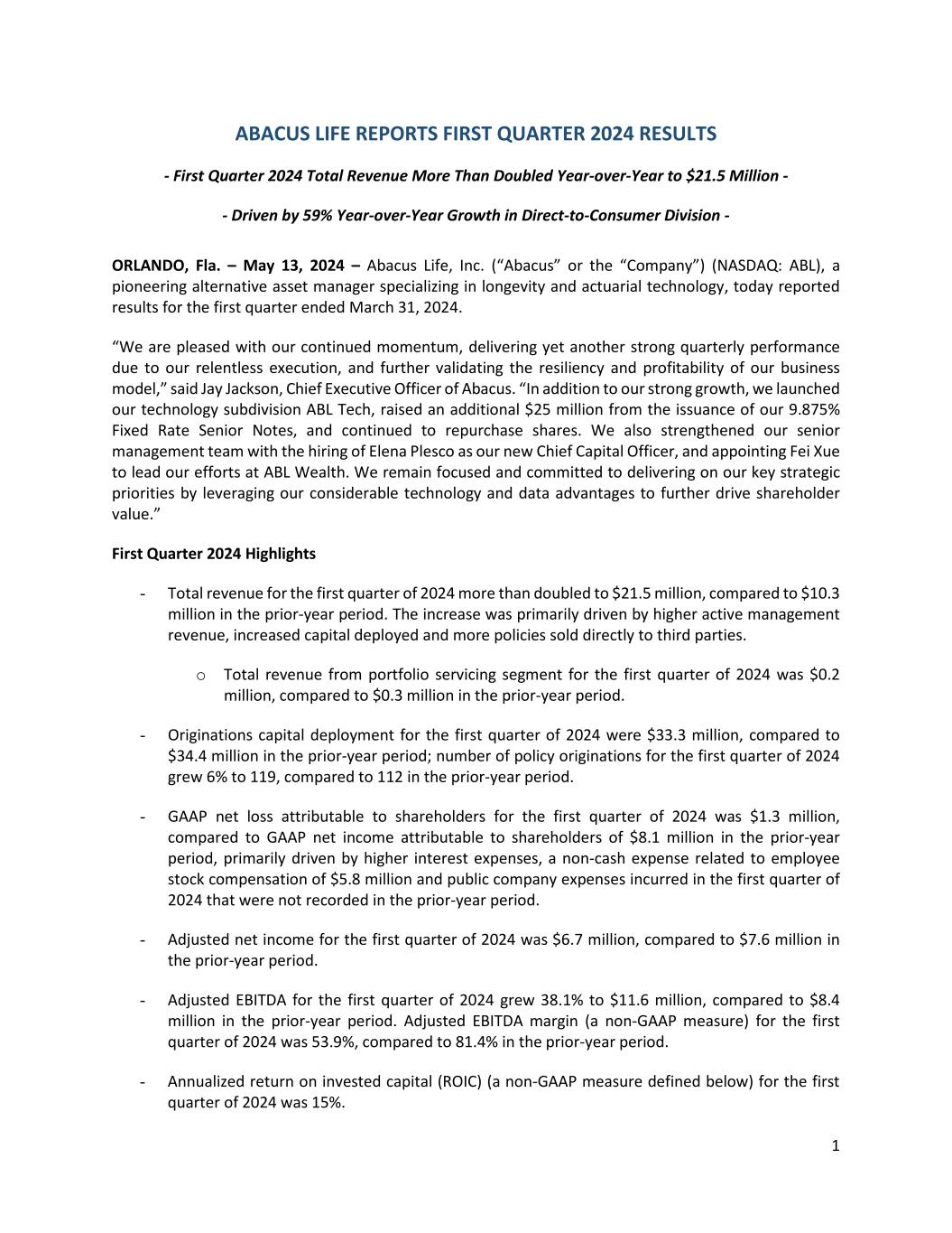 1 ABACUS LIFE REPORTS FIRST QUARTER 2024 RESULTS - First Quarter 2024 Total Revenue More Than Doubled Year-over-Year to $21.5 Million - - Driven by 59% Year-over-Year Growth in Direct-to-Consumer Division - ORLANDO, Fla. – May 13, 2024 – Abacus Life, Inc. (“Abacus” or the “Company”) (NASDAQ: ABL), a pioneering alternative asset manager specializing in longevity and actuarial technology, today reported results for the first quarter ended March 31, 2024. “We are pleased with our continued momentum, delivering yet another strong quarterly performance due to our relentless execution, and further validating the resiliency and profitability of our business model,” said Jay Jackson, Chief Executive Officer of Abacus. “In addition to our strong growth, we launched our technology subdivision ABL Tech, raised an additional $25 million from the issuance of our 9.875% Fixed Rate Senior Notes, and continued to repurchase shares. We also strengthened our senior management team with the hiring of Elena Plesco as our new Chief Capital Officer, and appointing Fei Xue to lead our efforts at ABL Wealth. We remain focused and committed to delivering on our key strategic priorities by leveraging our considerable technology and data advantages to further drive shareholder value.” First Quarter 2024 Highlights - Total revenue for the first quarter of 2024 more than doubled to $21.5 million, compared to $10.3 million in the prior-year period. The increase was primarily driven by higher active management revenue, increased capital deployed and more policies sold directly to third parties. o Total revenue from portfolio servicing segment for the first quarter of 2024 was $0.2 million, compared to $0.3 million in the prior-year period. - Originations capital deployment for the first quarter of 2024 were $33.3 million, compared to $34.4 million in the prior-year period; number of policy originations for the first quarter of 2024 grew 6% to 119, compared to 112 in the prior-year period. - GAAP net loss attributable to shareholders for the first quarter of 2024 was $1.3 million, compared to GAAP net income attributable to shareholders of $8.1 million in the prior-year period, primarily driven by higher interest expenses, a non-cash expense related to employee stock compensation of $5.8 million and public company expenses incurred in the first quarter of 2024 that were not recorded in the prior-year period. - Adjusted net income for the first quarter of 2024 was $6.7 million, compared to $7.6 million in the prior-year period. - Adjusted EBITDA for the first quarter of 2024 grew 38.1% to $11.6 million, compared to $8.4 million in the prior-year period. Adjusted EBITDA margin (a non-GAAP measure) for the first quarter of 2024 was 53.9%, compared to 81.4% in the prior-year period. - Annualized return on invested capital (ROIC) (a non-GAAP measure defined below) for the first quarter of 2024 was 15%.
