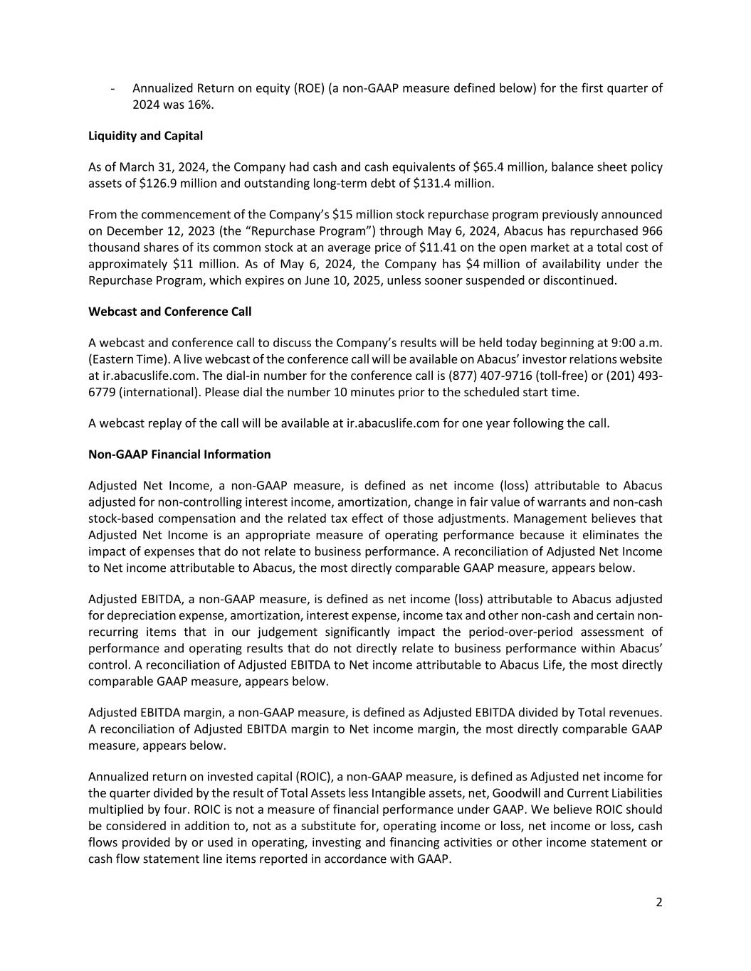 2 - Annualized Return on equity (ROE) (a non-GAAP measure defined below) for the first quarter of 2024 was 16%. Liquidity and Capital As of March 31, 2024, the Company had cash and cash equivalents of $65.4 million, balance sheet policy assets of $126.9 million and outstanding long-term debt of $131.4 million. From the commencement of the Company’s $15 million stock repurchase program previously announced on December 12, 2023 (the “Repurchase Program”) through May 6, 2024, Abacus has repurchased 966 thousand shares of its common stock at an average price of $11.41 on the open market at a total cost of approximately $11 million. As of May 6, 2024, the Company has $4 million of availability under the Repurchase Program, which expires on June 10, 2025, unless sooner suspended or discontinued. Webcast and Conference Call A webcast and conference call to discuss the Company’s results will be held today beginning at 9:00 a.m. (Eastern Time). A live webcast of the conference call will be available on Abacus’ investor relations website at ir.abacuslife.com. The dial-in number for the conference call is (877) 407-9716 (toll-free) or (201) 493- 6779 (international). Please dial the number 10 minutes prior to the scheduled start time. A webcast replay of the call will be available at ir.abacuslife.com for one year following the call. Non-GAAP Financial Information Adjusted Net Income, a non-GAAP measure, is defined as net income (loss) attributable to Abacus adjusted for non-controlling interest income, amortization, change in fair value of warrants and non-cash stock-based compensation and the related tax effect of those adjustments. Management believes that Adjusted Net Income is an appropriate measure of operating performance because it eliminates the impact of expenses that do not relate to business performance. A reconciliation of Adjusted Net Income to Net income attributable to Abacus, the most directly comparable GAAP measure, appears below. Adjusted EBITDA, a non-GAAP measure, is defined as net income (loss) attributable to Abacus adjusted for depreciation expense, amortization, interest expense, income tax and other non-cash and certain non- recurring items that in our judgement significantly impact the period-over-period assessment of performance and operating results that do not directly relate to business performance within Abacus’ control. A reconciliation of Adjusted EBITDA to Net income attributable to Abacus Life, the most directly comparable GAAP measure, appears below. Adjusted EBITDA margin, a non-GAAP measure, is defined as Adjusted EBITDA divided by Total revenues. A reconciliation of Adjusted EBITDA margin to Net income margin, the most directly comparable GAAP measure, appears below. Annualized return on invested capital (ROIC), a non-GAAP measure, is defined as Adjusted net income for the quarter divided by the result of Total Assets less Intangible assets, net, Goodwill and Current Liabilities multiplied by four. ROIC is not a measure of financial performance under GAAP. We believe ROIC should be considered in addition to, not as a substitute for, operating income or loss, net income or loss, cash flows provided by or used in operating, investing and financing activities or other income statement or cash flow statement line items reported in accordance with GAAP.