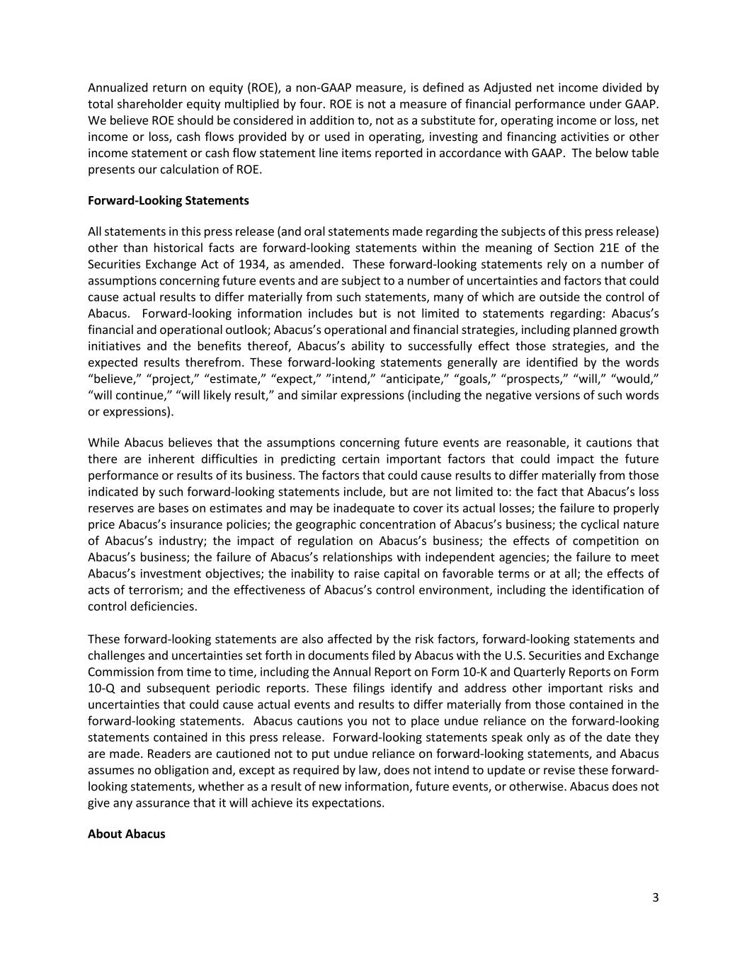 3 Annualized return on equity (ROE), a non-GAAP measure, is defined as Adjusted net income divided by total shareholder equity multiplied by four. ROE is not a measure of financial performance under GAAP. We believe ROE should be considered in addition to, not as a substitute for, operating income or loss, net income or loss, cash flows provided by or used in operating, investing and financing activities or other income statement or cash flow statement line items reported in accordance with GAAP. The below table presents our calculation of ROE. Forward-Looking Statements All statements in this press release (and oral statements made regarding the subjects of this press release) other than historical facts are forward-looking statements within the meaning of Section 21E of the Securities Exchange Act of 1934, as amended. These forward-looking statements rely on a number of assumptions concerning future events and are subject to a number of uncertainties and factors that could cause actual results to differ materially from such statements, many of which are outside the control of Abacus. Forward-looking information includes but is not limited to statements regarding: Abacus’s financial and operational outlook; Abacus’s operational and financial strategies, including planned growth initiatives and the benefits thereof, Abacus’s ability to successfully effect those strategies, and the expected results therefrom. These forward-looking statements generally are identified by the words “believe,” “project,” “estimate,” “expect,” ”intend,” “anticipate,” “goals,” “prospects,” “will,” “would,” “will continue,” “will likely result,” and similar expressions (including the negative versions of such words or expressions). While Abacus believes that the assumptions concerning future events are reasonable, it cautions that there are inherent difficulties in predicting certain important factors that could impact the future performance or results of its business. The factors that could cause results to differ materially from those indicated by such forward-looking statements include, but are not limited to: the fact that Abacus’s loss reserves are bases on estimates and may be inadequate to cover its actual losses; the failure to properly price Abacus’s insurance policies; the geographic concentration of Abacus’s business; the cyclical nature of Abacus’s industry; the impact of regulation on Abacus’s business; the effects of competition on Abacus’s business; the failure of Abacus’s relationships with independent agencies; the failure to meet Abacus’s investment objectives; the inability to raise capital on favorable terms or at all; the effects of acts of terrorism; and the effectiveness of Abacus’s control environment, including the identification of control deficiencies. These forward-looking statements are also affected by the risk factors, forward-looking statements and challenges and uncertainties set forth in documents filed by Abacus with the U.S. Securities and Exchange Commission from time to time, including the Annual Report on Form 10-K and Quarterly Reports on Form 10-Q and subsequent periodic reports. These filings identify and address other important risks and uncertainties that could cause actual events and results to differ materially from those contained in the forward-looking statements. Abacus cautions you not to place undue reliance on the forward-looking statements contained in this press release. Forward-looking statements speak only as of the date they are made. Readers are cautioned not to put undue reliance on forward-looking statements, and Abacus assumes no obligation and, except as required by law, does not intend to update or revise these forward- looking statements, whether as a result of new information, future events, or otherwise. Abacus does not give any assurance that it will achieve its expectations. About Abacus