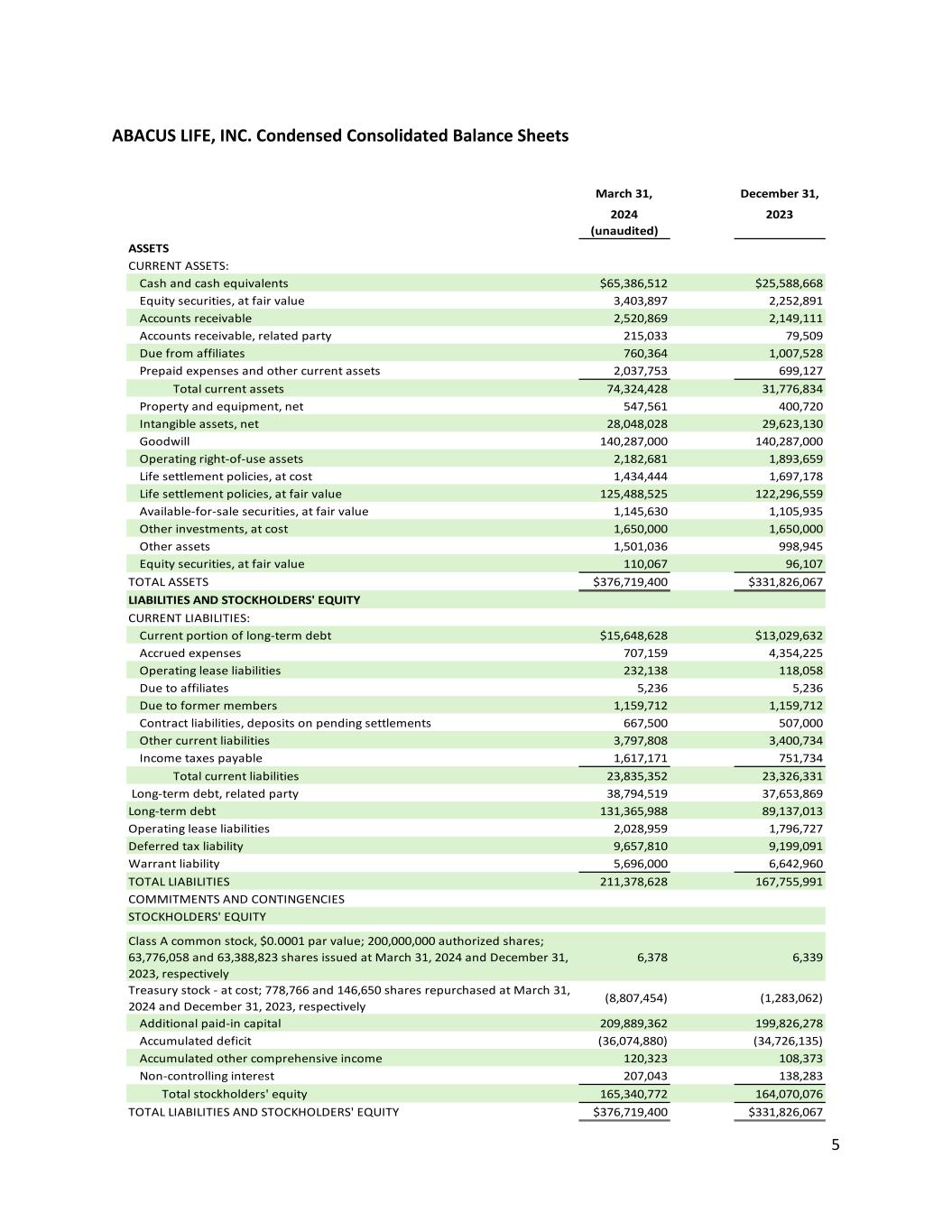 5 ABACUS LIFE, INC. Condensed Consolidated Balance Sheets March 31, December 31, 2024 2023 (unaudited) ASSETS CURRENT ASSETS: Cash and cash equivalents $65,386,512 $25,588,668 Equity securities, at fair value 3,403,897 2,252,891 Accounts receivable 2,520,869 2,149,111 Accounts receivable, related party 215,033 79,509 Due from affiliates 760,364 1,007,528 Prepaid expenses and other current assets 2,037,753 699,127 Total current assets 74,324,428 31,776,834 Property and equipment, net 547,561 400,720 Intangible assets, net 28,048,028 29,623,130 Goodwill 140,287,000 140,287,000 Operating right-of-use assets 2,182,681 1,893,659 Life settlement policies, at cost 1,434,444 1,697,178 Life settlement policies, at fair value 125,488,525 122,296,559 Available-for-sale securities, at fair value 1,145,630 1,105,935 Other investments, at cost 1,650,000 1,650,000 Other assets 1,501,036 998,945 Equity securities, at fair value 110,067 96,107 TOTAL ASSETS $376,719,400 $331,826,067 LIABILITIES AND STOCKHOLDERS' EQUITY CURRENT LIABILITIES: Current portion of long-term debt $15,648,628 $13,029,632 Accrued expenses 707,159 4,354,225 Operating lease liabilities 232,138 118,058 Due to affiliates 5,236 5,236 Due to former members 1,159,712 1,159,712 Contract liabilities, deposits on pending settlements 667,500 507,000 Other current liabilities 3,797,808 3,400,734 Income taxes payable 1,617,171 751,734 Total current liabilities 23,835,352 23,326,331 Long-term debt, related party 38,794,519 37,653,869 Long-term debt 131,365,988 89,137,013 Operating lease liabilities 2,028,959 1,796,727 Deferred tax liability 9,657,810 9,199,091 Warrant liability 5,696,000 6,642,960 TOTAL LIABILITIES 211,378,628 167,755,991 COMMITMENTS AND CONTINGENCIES STOCKHOLDERS' EQUITY Class A common stock, $0.0001 par value; 200,000,000 authorized shares; 63,776,058 and 63,388,823 shares issued at March 31, 2024 and December 31, 2023, respectively 6,378 6,339 Treasury stock - at cost; 778,766 and 146,650 shares repurchased at March 31, 2024 and December 31, 2023, respectively (8,807,454) (1,283,062) Additional paid-in capital 209,889,362 199,826,278 Accumulated deficit (36,074,880) (34,726,135) Accumulated other comprehensive income 120,323 108,373 Non-controlling interest 207,043 138,283 Total stockholders' equity 165,340,772 164,070,076 TOTAL LIABILITIES AND STOCKHOLDERS' EQUITY $376,719,400 $331,826,067