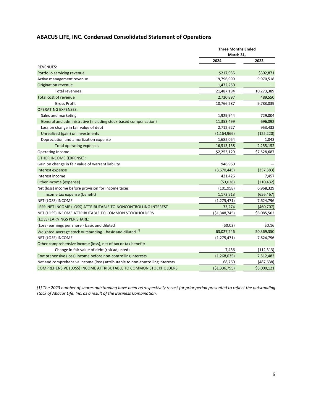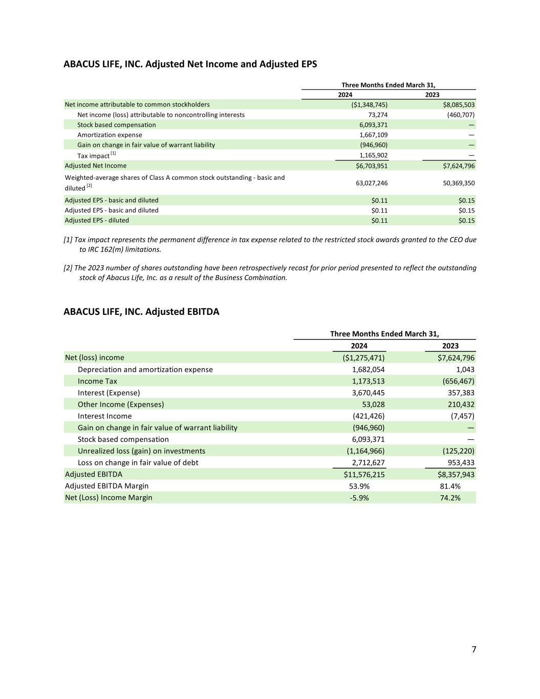 6 ABACUS LIFE, INC. Condensed Consolidated Statement of Operations [1] The 2023 number of shares outstanding have been retrospectively recast for prior period presented to reflect the outstanding stock of Abacus Life, Inc. as a result of the Business Combination. 2024 2023 REVENUES: Portfolio servicing revenue $217,935 $302,871 Active management revenue 19,796,999 9,970,518 Origination revenue 1,472,250 — Total revenues 21,487,184 10,273,389 Total cost of revenue 2,720,897 489,550 Gross Profit 18,766,287 9,783,839 OPERATING EXPENSES: Sales and marketing 1,929,944 729,004 General and administrative (including stock-based compensation) 11,353,499 696,892 Loss on change in fair value of debt 2,712,627 953,433 Unrealized (gain) on investments (1,164,966) (125,220) Depreciation and amortization expense 1,682,054 1,043 Total operating expenses 16,513,158 2,255,152 Operating Income $2,253,129 $7,528,687 OTHER INCOME (EXPENSE): Gain on change in fair value of warrant liability 946,960 — Interest expense (3,670,445) (357,383) Interest income 421,426 7,457 Other income (expense) (53,028) (210,432) Net (loss) income before provision for income taxes (101,958) 6,968,329 Income tax expense (benefit) 1,173,513 (656,467) NET (LOSS) INCOME (1,275,471) 7,624,796 LESS: NET INCOME (LOSS) ATTRIBUTABLE TO NONCONTROLLING INTEREST 73,274 (460,707) NET (LOSS) INCOME ATTRIBUTABLE TO COMMON STOCKHOLDERS ($1,348,745) $8,085,503 (LOSS) EARNINGS PER SHARE: (Loss) earnings per share - basic and diluted ($0.02) $0.16 Weighted-average stock outstanding—basic and diluted [1] 63,027,246 50,369,350 NET (LOSS) INCOME (1,275,471) 7,624,796 Other comprehensive income (loss), net of tax or tax benefit: Change in fair value of debt (risk adjusted) 7,436 (112,313) Comprehensive (loss) income before non-controlling interests (1,268,035) 7,512,483 Net and comprehensive income (loss) attributable to non-controlling interests 68,760 (487,638) COMPREHENSIVE (LOSS) INCOME ATTRIBUTABLE TO COMMON STOCKHOLDERS ($1,336,795) $8,000,121 Three Months Ended March 31,