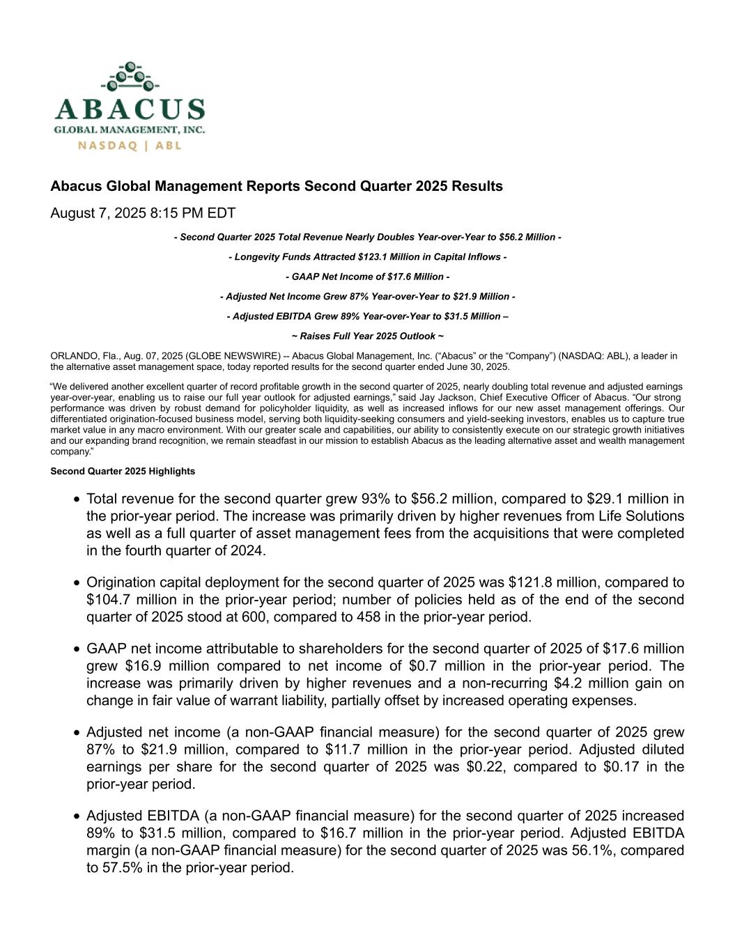 Abacus Global Management Reports Second Quarter 2025 Results August 7, 2025 8:15 PM EDT - Second Quarter 2025 Total Revenue Nearly Doubles Year-over-Year to $56.2 Million - - Longevity Funds Attracted $123.1 Million in Capital Inflows - - GAAP Net Income of $17.6 Million - - Adjusted Net Income Grew 87% Year-over-Year to $21.9 Million - - Adjusted EBITDA Grew 89% Year-over-Year to $31.5 Million – ~ Raises Full Year 2025 Outlook ~ ORLANDO, Fla., Aug. 07, 2025 (GLOBE NEWSWIRE) -- Abacus Global Management, Inc. (“Abacus” or the “Company”) (NASDAQ: ABL), a leader in the alternative asset management space, today reported results for the second quarter ended June 30, 2025. “We delivered another excellent quarter of record profitable growth in the second quarter of 2025, nearly doubling total revenue and adjusted earnings year-over-year, enabling us to raise our full year outlook for adjusted earnings,” said Jay Jackson, Chief Executive Officer of Abacus. “Our strong performance was driven by robust demand for policyholder liquidity, as well as increased inflows for our new asset management offerings. Our differentiated origination-focused business model, serving both liquidity-seeking consumers and yield-seeking investors, enables us to capture true market value in any macro environment. With our greater scale and capabilities, our ability to consistently execute on our strategic growth initiatives and our expanding brand recognition, we remain steadfast in our mission to establish Abacus as the leading alternative asset and wealth management company.” Second Quarter 2025 Highlights Total revenue for the second quarter grew 93% to $56.2 million, compared to $29.1 million in the prior-year period. The increase was primarily driven by higher revenues from Life Solutions as well as a full quarter of asset management fees from the acquisitions that were completed in the fourth quarter of 2024. Origination capital deployment for the second quarter of 2025 was $121.8 million, compared to $104.7 million in the prior-year period; number of policies held as of the end of the second quarter of 2025 stood at 600, compared to 458 in the prior-year period. GAAP net income attributable to shareholders for the second quarter of 2025 of $17.6 million grew $16.9 million compared to net income of $0.7 million in the prior-year period. The increase was primarily driven by higher revenues and a non-recurring $4.2 million gain on change in fair value of warrant liability, partially offset by increased operating expenses. Adjusted net income (a non-GAAP financial measure) for the second quarter of 2025 grew 87% to $21.9 million, compared to $11.7 million in the prior-year period. Adjusted diluted earnings per share for the second quarter of 2025 was $0.22, compared to $0.17 in the prior-year period. Adjusted EBITDA (a non-GAAP financial measure) for the second quarter of 2025 increased 89% to $31.5 million, compared to $16.7 million in the prior-year period. Adjusted EBITDA margin (a non-GAAP financial measure) for the second quarter of 2025 was 56.1%, compared to 57.5% in the prior-year period.
