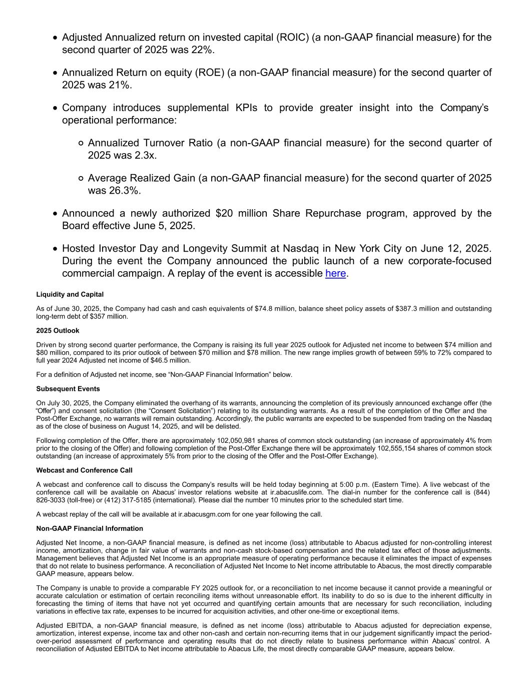 Adjusted Annualized return on invested capital (ROIC) (a non-GAAP financial measure) for the second quarter of 2025 was 22%. Annualized Return on equity (ROE) (a non-GAAP financial measure) for the second quarter of 2025 was 21%. Company introduces supplemental KPIs to provide greater insight into the Company’s operational performance: Annualized Turnover Ratio (a non-GAAP financial measure) for the second quarter of 2025 was 2.3x. Average Realized Gain (a non-GAAP financial measure) for the second quarter of 2025 was 26.3%. Announced a newly authorized $20 million Share Repurchase program, approved by the Board effective June 5, 2025. Hosted Investor Day and Longevity Summit at Nasdaq in New York City on June 12, 2025. During the event the Company announced the public launch of a new corporate-focused commercial campaign. A replay of the event is accessible here. Liquidity and Capital As of June 30, 2025, the Company had cash and cash equivalents of $74.8 million, balance sheet policy assets of $387.3 million and outstanding long-term debt of $357 million. 2025 Outlook Driven by strong second quarter performance, the Company is raising its full year 2025 outlook for Adjusted net income to between $74 million and $80 million, compared to its prior outlook of between $70 million and $78 million. The new range implies growth of between 59% to 72% compared to full year 2024 Adjusted net income of $46.5 million. For a definition of Adjusted net income, see “Non-GAAP Financial Information” below. Subsequent Events On July 30, 2025, the Company eliminated the overhang of its warrants, announcing the completion of its previously announced exchange offer (the “Offer”) and consent solicitation (the “Consent Solicitation”) relating to its outstanding warrants. As a result of the completion of the Offer and the Post-Offer Exchange, no warrants will remain outstanding. Accordingly, the public warrants are expected to be suspended from trading on the Nasdaq as of the close of business on August 14, 2025, and will be delisted. Following completion of the Offer, there are approximately 102,050,981 shares of common stock outstanding (an increase of approximately 4% from prior to the closing of the Offer) and following completion of the Post-Offer Exchange there will be approximately 102,555,154 shares of common stock outstanding (an increase of approximately 5% from prior to the closing of the Offer and the Post-Offer Exchange). Webcast and Conference Call A webcast and conference call to discuss the Company’s results will be held today beginning at 5:00 p.m. (Eastern Time). A live webcast of the conference call will be available on Abacus’ investor relations website at ir.abacuslife.com. The dial-in number for the conference call is (844) 826-3033 (toll-free) or (412) 317-5185 (international). Please dial the number 10 minutes prior to the scheduled start time. A webcast replay of the call will be available at ir.abacusgm.com for one year following the call. Non-GAAP Financial Information Adjusted Net Income, a non-GAAP financial measure, is defined as net income (loss) attributable to Abacus adjusted for non-controlling interest income, amortization, change in fair value of warrants and non-cash stock-based compensation and the related tax effect of those adjustments. Management believes that Adjusted Net Income is an appropriate measure of operating performance because it eliminates the impact of expenses that do not relate to business performance. A reconciliation of Adjusted Net Income to Net income attributable to Abacus, the most directly comparable GAAP measure, appears below. The Company is unable to provide a comparable FY 2025 outlook for, or a reconciliation to net income because it cannot provide a meaningful or accurate calculation or estimation of certain reconciling items without unreasonable effort. Its inability to do so is due to the inherent difficulty in forecasting the timing of items that have not yet occurred and quantifying certain amounts that are necessary for such reconciliation, including variations in effective tax rate, expenses to be incurred for acquisition activities, and other one-time or exceptional items. Adjusted EBITDA, a non-GAAP financial measure, is defined as net income (loss) attributable to Abacus adjusted for depreciation expense, amortization, interest expense, income tax and other non-cash and certain non-recurring items that in our judgement significantly impact the period- over-period assessment of performance and operating results that do not directly relate to business performance within Abacus’ control. A reconciliation of Adjusted EBITDA to Net income attributable to Abacus Life, the most directly comparable GAAP measure, appears below.