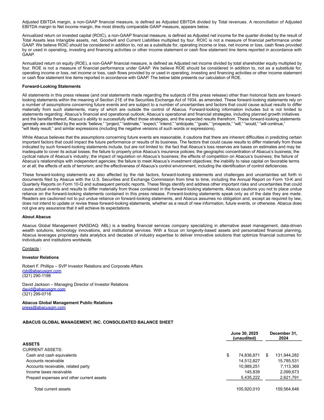 Adjusted EBITDA margin, a non-GAAP financial measure, is defined as Adjusted EBITDA divided by Total revenues. A reconciliation of Adjusted EBITDA margin to Net income margin, the most directly comparable GAAP measure, appears below. Annualized return on invested capital (ROIC), a non-GAAP financial measure, is defined as Adjusted net income for the quarter divided by the result of Total Assets less Intangible assets, net, Goodwill and Current Liabilities multiplied by four. ROIC is not a measure of financial performance under GAAP. We believe ROIC should be considered in addition to, not as a substitute for, operating income or loss, net income or loss, cash flows provided by or used in operating, investing and financing activities or other income statement or cash flow statement line items reported in accordance with GAAP. Annualized return on equity (ROE), a non-GAAP financial measure, is defined as Adjusted net income divided by total shareholder equity multiplied by four. ROE is not a measure of financial performance under GAAP. We believe ROE should be considered in addition to, not as a substitute for, operating income or loss, net income or loss, cash flows provided by or used in operating, investing and financing activities or other income statement or cash flow statement line items reported in accordance with GAAP. The below table presents our calculation of ROE. Forward-Looking Statements All statements in this press release (and oral statements made regarding the subjects of this press release) other than historical facts are forward- looking statements within the meaning of Section 21E of the Securities Exchange Act of 1934, as amended. These forward-looking statements rely on a number of assumptions concerning future events and are subject to a number of uncertainties and factors that could cause actual results to differ materially from such statements, many of which are outside the control of Abacus. Forward-looking information includes but is not limited to statements regarding: Abacus’s financial and operational outlook; Abacus’s operational and financial strategies, including planned growth initiatives and the benefits thereof, Abacus’s ability to successfully effect those strategies, and the expected results therefrom. These forward-looking statements generally are identified by the words “believe,” “project,” “estimate,” “expect,” “intend,” “anticipate,” “goals,” “prospects,” “will,” “would,” “will continue,” “will likely result,” and similar expressions (including the negative versions of such words or expressions). While Abacus believes that the assumptions concerning future events are reasonable, it cautions that there are inherent difficulties in predicting certain important factors that could impact the future performance or results of its business. The factors that could cause results to differ materially from those indicated by such forward-looking statements include, but are not limited to: the fact that Abacus’s loss reserves are bases on estimates and may be inadequate to cover its actual losses; the failure to properly price Abacus’s insurance policies; the geographic concentration of Abacus’s business; the cyclical nature of Abacus’s industry; the impact of regulation on Abacus’s business; the effects of competition on Abacus’s business; the failure of Abacus’s relationships with independent agencies; the failure to meet Abacus’s investment objectives; the inability to raise capital on favorable terms or at all; the effects of acts of terrorism; and the effectiveness of Abacus’s control environment, including the identification of control deficiencies. These forward-looking statements are also affected by the risk factors, forward-looking statements and challenges and uncertainties set forth in documents filed by Abacus with the U.S. Securities and Exchange Commission from time to time, including the Annual Report on Form 10-K and Quarterly Reports on Form 10-Q and subsequent periodic reports. These filings identify and address other important risks and uncertainties that could cause actual events and results to differ materially from those contained in the forward-looking statements. Abacus cautions you not to place undue reliance on the forward-looking statements contained in this press release. Forward-looking statements speak only as of the date they are made. Readers are cautioned not to put undue reliance on forward-looking statements, and Abacus assumes no obligation and, except as required by law, does not intend to update or revise these forward-looking statements, whether as a result of new information, future events, or otherwise. Abacus does not give any assurance that it will achieve its expectations. About Abacus Abacus Global Management (NASDAQ: ABL) is a leading financial services company specializing in alternative asset management, data-driven wealth solutions, technology innovations, and institutional services. With a focus on longevity-based assets and personalized financial planning, Abacus leverages proprietary data analytics and decades of industry expertise to deliver innovative solutions that optimize financial outcomes for individuals and institutions worldwide. Contacts : Investor Relations Robert F. Phillips – SVP Investor Relations and Corporate Affairs rob@abacusgm.com (321) 290-1198 David Jackson – Managing Director of Investor Relations david@abacusgm.com (321) 299-0716 Abacus Global Management Public Relations press@abacusgm.com ABACUS GLOBAL MANAGEMENT, INC. CONSOLIDATED BALANCE SHEET June 30, 2025 (unaudited) December 31, 2024 ASSETS CURRENT ASSETS: Cash and cash equivalents $ 74,836,871 $ 131,944,282 Accounts receivable 14,512,827 15,785,531 Accounts receivable, related party 10,989,251 7,113,369 Income taxes receivable 145,839 2,099,673 Prepaid expenses and other current assets 5,435,222 2,621,791 Total current assets 105,920,010 159,564,646