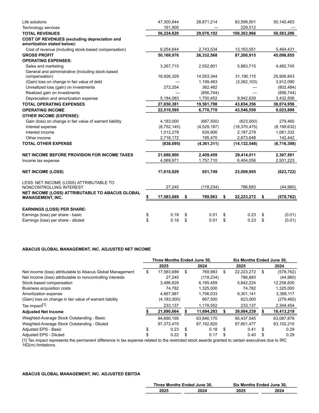Life solutions 47,300,844 28,871,214 83,599,501 50,140,463 Technology services 161,900 — 229,512 — TOTAL REVENUES 56,224,620 29,076,102 100,363,966 50,563,286 COST OF REVENUES (excluding depreciation and amortization stated below): Cost of revenue (including stock-based compensation) 6,054,644 2,743,534 13,163,051 5,464,431 GROSS PROFIT 50,169,976 26,332,568 87,200,915 45,098,855 OPERATING EXPENSES: Sales and marketing 3,267,715 2,552,801 5,883,715 4,482,745 General and administrative (including stock-based compensation) 18,926,329 14,553,344 31,190,115 25,906,843 (Gain) loss on change in fair value of debt — 1,199,463 (3,362,103) 3,912,090 Unrealized loss (gain) on investments 272,254 362,482 — (802,484) Realized gain on investments — (856,744) — (856,744) Depreciation and amortization expense 5,184,083 1,750,452 9,942,629 3,432,506 TOTAL OPERATING EXPENSES 27,650,381 19,561,798 43,654,356 36,074,956 OPERATING INCOME 22,519,595 6,770,770 43,546,559 9,023,899 OTHER INCOME (EXPENSE): Gain (loss) on change in fair value of warrant liability 4,183,000 (667,500) (623,000) 279,460 Interest expense (8,752,145) (4,529,187) (18,370,475) (8,199,632) Interest income 1,012,278 639,906 2,187,279 1,061,332 Other income 2,718,172 195,470 2,673,648 142,442 TOTAL OTHER EXPENSE (838,695) (4,361,311) (14,132,548) (6,716,398) NET INCOME BEFORE PROVISION FOR INCOME TAXES 21,680,900 2,409,459 29,414,011 2,307,501 Income tax expense 4,069,971 1,757,710 6,404,056 2,931,223 NET INCOME (LOSS) 17,610,929 651,749 23,009,955 (623,722) LESS: NET INCOME (LOSS) ATTRIBUTABLE TO NONCONTROLLING INTEREST 27,240 (118,234) 786,683 (44,960) NET INCOME (LOSS) ATTRIBUTABLE TO ABACUS GLOBAL MANAGEMENT, INC. $ 17,583,689 $ 769,983 $ 22,223,272 $ (578,762) EARNINGS (LOSS) PER SHARE: Earnings (loss) per share - basic $ 0.18 $ 0.01 $ 0.23 $ (0.01) Earnings (loss) per share - diluted $ 0.18 $ 0.01 $ 0.23 $ (0.01) ABACUS GLOBAL MANAGEMENT, INC. ADJUSTED NET INCOME Three Months Ended June 30, Six Months Ended June 30, 2025 2024 2025 2024 Net income (loss) attributable to Abacus Global Management $ 17,583,689 $ 769,983 $ 22,223,272 $ (578,762) Net income (loss) attributable to noncontrolling interests 27,240 (118,234) 786,683 (44,960) Stock-based compensation 3,486,829 6,165,459 5,842,224 12,258,830 Business acquisition costs 74,782 1,325,000 74,782 1,325,000 Amortization expense 4,667,987 1,706,033 9,301,141 3,388,117 (Gain) loss on change in fair value of warrant liability (4,183,000) 667,500 623,000 (279,460) Tax impact[1] 233,137 1,178,552 233,137 2,344,454 Adjusted Net Income $ 21,890,664 $ 11,694,293 $ 39,084,239 $ 18,413,219 Weighted-Average Stock Outstanding - Basic 94,690,195 63,846,170 95,437,545 63,087,878 Weighted-Average Stock Outstanding - Diluted 97,372,470 67,162,820 97,801,477 63,102,210 Adjusted EPS - Basic $ 0.23 $ 0.18 $ 0.41 $ 0.29 Adjusted EPS - Diluted $ 0.22 $ 0.17 $ 0.40 $ 0.29 [1] Tax impact represents the permanent difference in tax expense related to the restricted stock awards granted to certain executives due to IRC 162(m) limitations. ABACUS GLOBAL MANAGEMENT, INC. ADJUSTED EBITDA Three Months Ended June 30, Six Months Ended June 30, 2025 2024 2025 2024