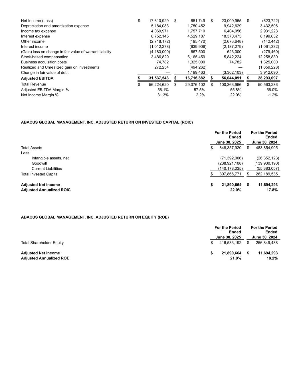 Net Income (Loss) $ 17,610,929 $ 651,749 $ 23,009,955 $ (623,722) Depreciation and amortization expense 5,184,083 1,750,452 9,942,629 3,432,506 Income tax expense 4,069,971 1,757,710 6,404,056 2,931,223 Interest expense 8,752,145 4,529,187 18,370,475 8,199,632 Other income (2,718,172) (195,470) (2,673,648) (142,442) Interest income (1,012,278) (639,906) (2,187,279) (1,061,332) (Gain) loss on change in fair value of warrant liability (4,183,000) 667,500 623,000 (279,460) Stock-based compensation 3,486,829 6,165,459 5,842,224 12,258,830 Business acquisition costs 74,782 1,325,000 74,782 1,325,000 Realized and Unrealized gain on investments 272,254 (494,262) — (1,659,228) Change in fair value of debt — 1,199,463 (3,362,103) 3,912,090 Adjusted EBITDA $ 31,537,543 $ 16,716,882 $ 56,044,091 $ 28,293,097 Total Revenue $ 56,224,620 $ 29,076,102 $ 100,363,966 $ 50,563,286 Adjusted EBITDA Margin % 56.1% 57.5% 55.8% 56.0% Net Income Margin % 31.3% 2.2% 22.9% -1.2% ABACUS GLOBAL MANAGEMENT, INC. ADJUSTED RETURN ON INVESTED CAPITAL (ROIC) For the Period Ended For the Period Ended June 30, 2025 June 30, 2024 Total Assets $ 848,357,920 $ 483,854,905 Less: Intangible assets, net (71,392,006) (26,352,123) Goodwill (238,921,108) (139,930,190) Current Liabilities (140,178,035) (55,383,057) Total Invested Capital $ 397,866,771 $ 262,189,535 Adjusted Net income $ 21,890,664 $ 11,694,293 Adjusted Annualized ROIC 22.0% 17.8% ABACUS GLOBAL MANAGEMENT, INC. ADJUSTED RETURN ON EQUITY (ROE) For the Period Ended For the Period Ended June 30, 2025 June 30, 2024 Total Shareholder Equity $ 416,533,192 $ 256,849,488 Adjusted Net income $ 21,890,664 $ 11,694,293 Adjusted Annualized ROE 21.0% 18.2%